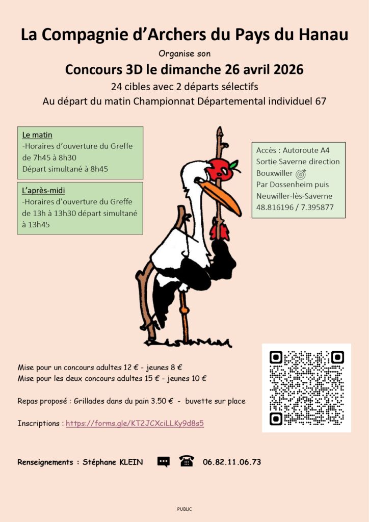 Concours 3D du 26 avril 2026 Au départ du matin Championnat Départemental individuel 67 Inscription: https://forms.gle/KT2JCXciLLKy9d8s5